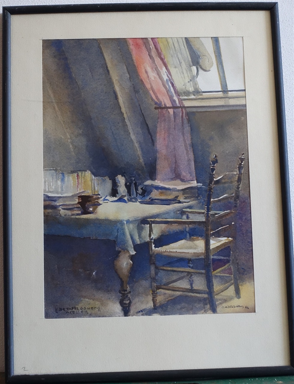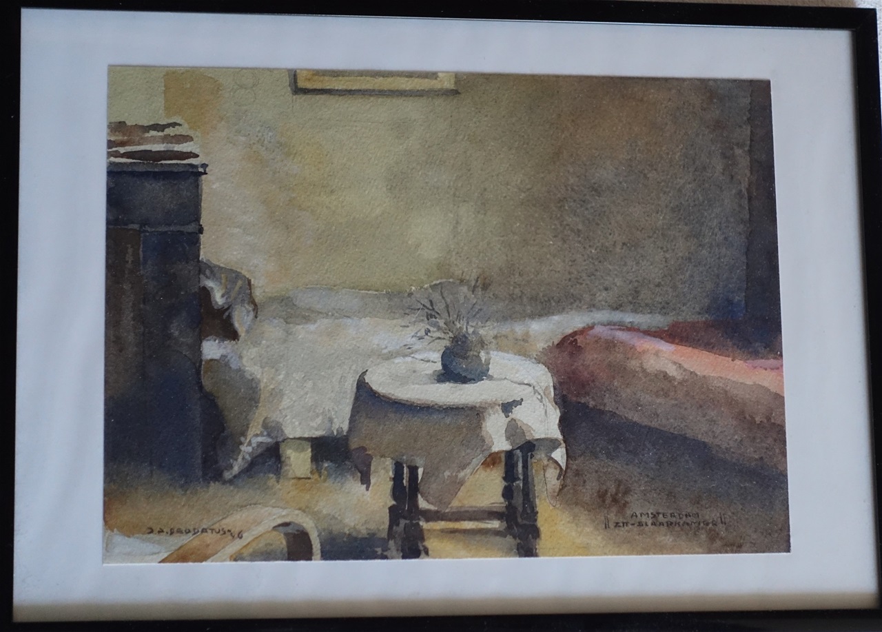 aquarel, 1946, de nieuwe gezamelijke zolderkamers op de Frans van Mierisstraat te Amsterdam.